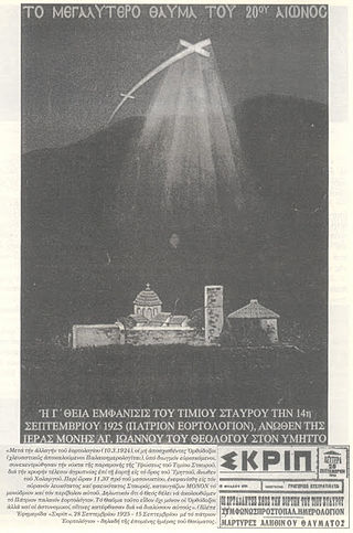 Una Iglesia perseguida: En 1925 ocurrió el suceso más conocido: Una gran cruz luminosa apareció en el cielo sobre una iglesia vetero calendarista (el Monasterio de San Juan el Teólogo en Himeto, Atenas) escondida a causa de las persecuciones, lo que fue admirado por cientos de personas en la fiesta de la Exaltación de la Santa Cruz, muchos de los testigos fueron personajes notables de la sociedad e incluso la policía que fueron a arrestar al tumulto causado por este evento, y de los presentes muchos se convirtieron esa noche a la verdadera Iglesia Ortodoxa que mantiene los santos Canones.